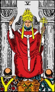 El Sumo Sacerdote es a veces etiquetados como El Papa, y simboliza las organizadas enseñanzas religiosas. El Sumo Sacerdote se encuentra entre dos pilares, al igual que lo hace la Suma Sacerdotisa. En la Cábala, sus pilares son el árbol de la vida, en representación de Misericordia y la Severidad. Siendo una de ellas la ley y la otra el libre albedrío. Ambos, sin embargo, son necesarios, porque el hombre debe tomar decisiones en cuanto a si va a obedecer o desafiar.